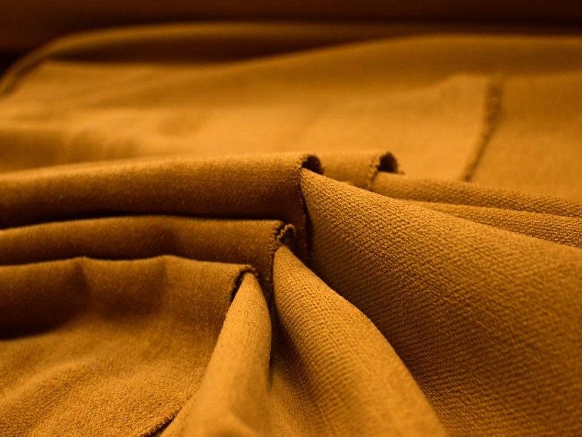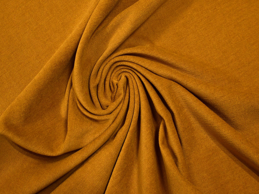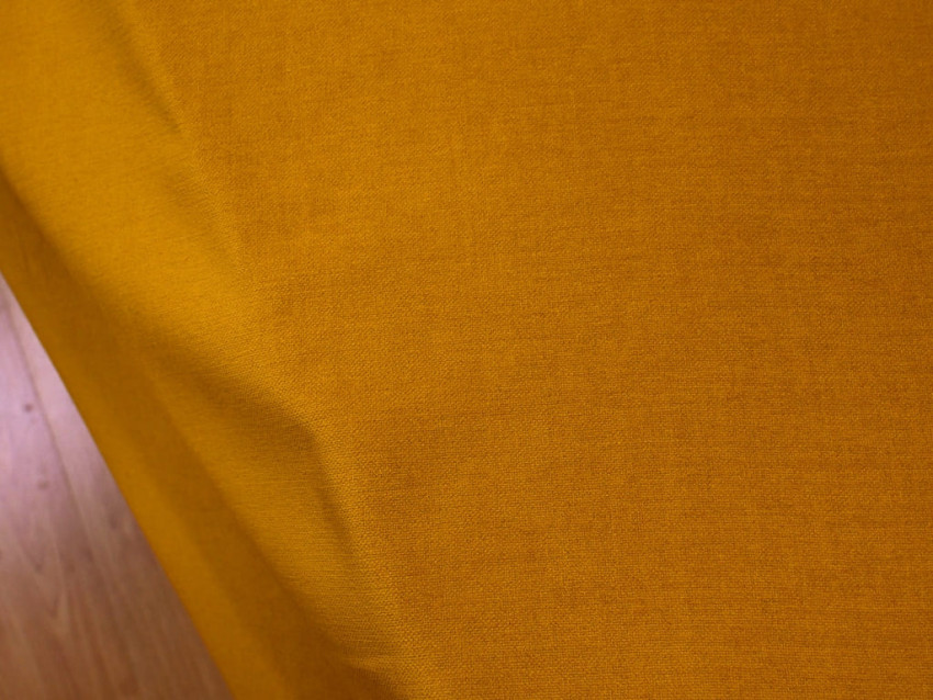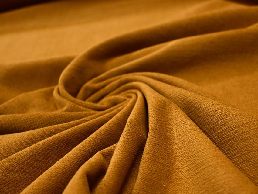Chenilla premium mostaza curry, 100 % poliéster (450 g/m²) y 200 000 ciclos Martindale.
