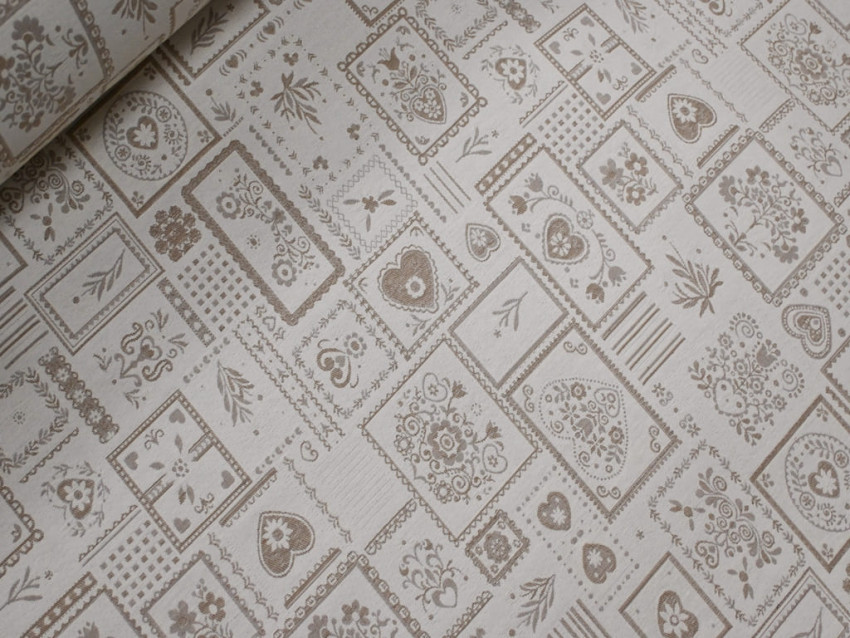 El diseño reproduce un efecto patchwork de cuadros rectangulares y cuadrados con pequeños motivos florales y corazones, en escala media. Los marcos y cenefas recuerdan a los bordados tradicionales, creando un efecto acogedor y muy decorativo. La gama de beige sobre fondo claro encaja de maravilla en ambientes rústicos, shabby chic, estilo casa de campo o espacios nórdicos que buscan calidez sin recargar el color.