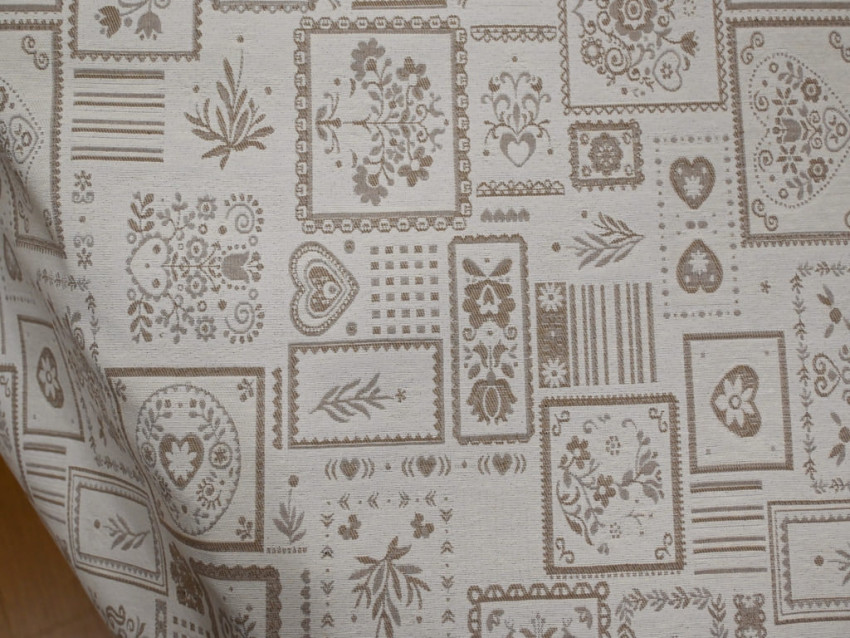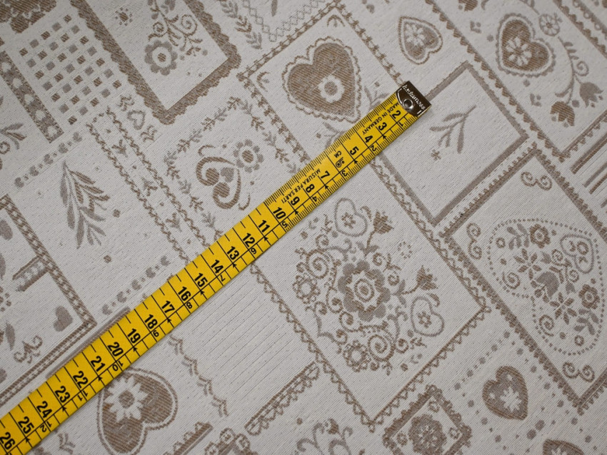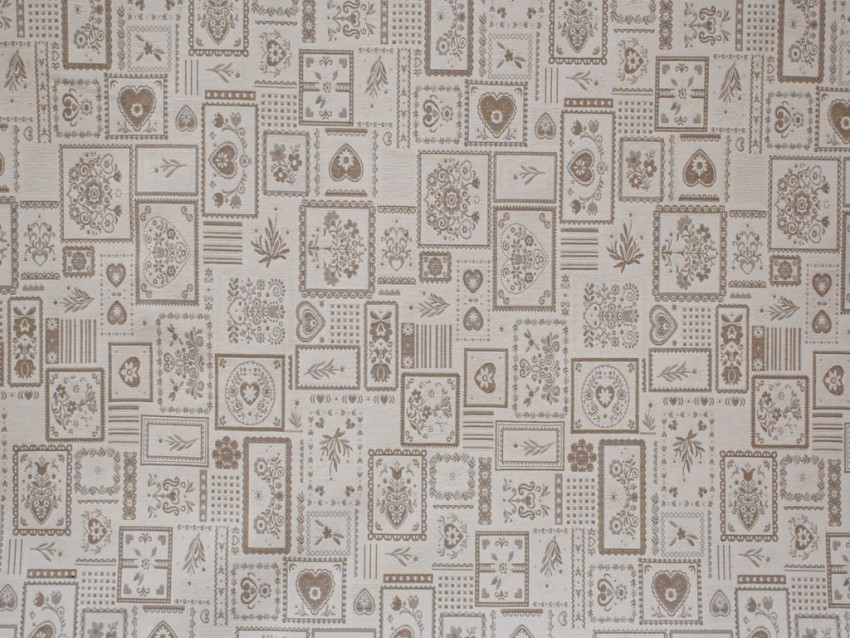 Tejido gobelino patchwork de corazones y flores en tonos beige, ancho 280 cm y 310 g/m², mezcla 40% algodón 60% poliéster. Firme y con cuerpo, ideal para tapicería, cojines, cortinas y complementos decorativos de estilo rústico y acogedor.