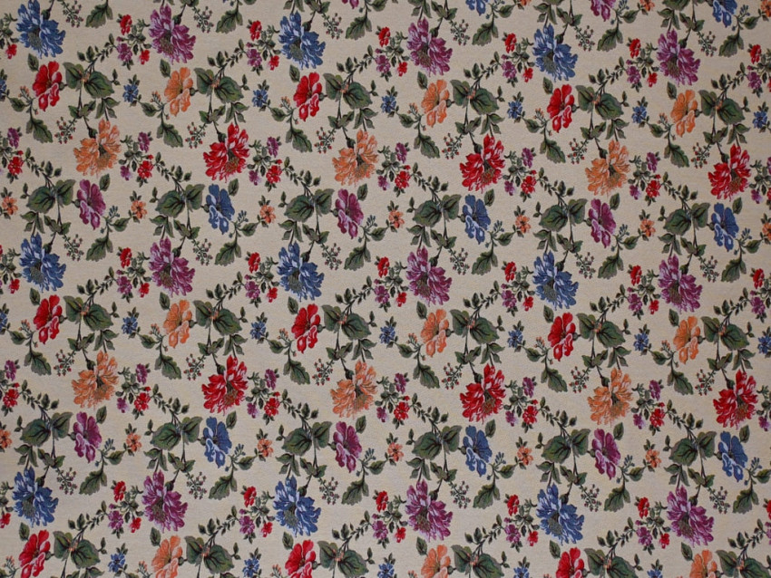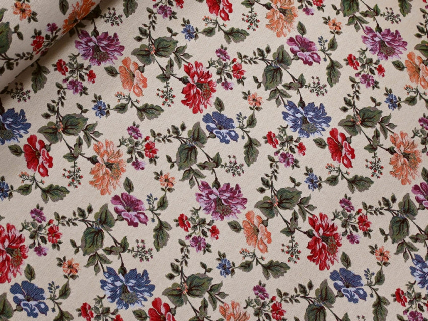 El estampado combina flores de distintos tamaños unidas por ramas y pequeñas hojas, creando un patrón continuo y armonioso. La mezcla de tonos vibrantes —rojos, violetas, naranjas, azules y verdes— sobre el fondo beige aporta un equilibrio perfecto entre color y sobriedad. Este diseño encaja especialmente bien en ambientes tradicionales, rústicos y románticos, aportando un toque clásico y elegante sin resultar recargado.
