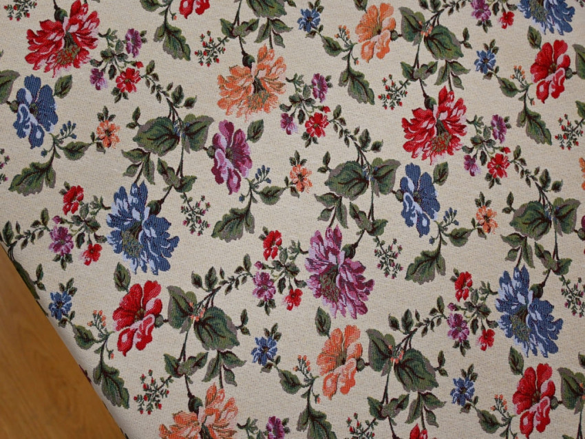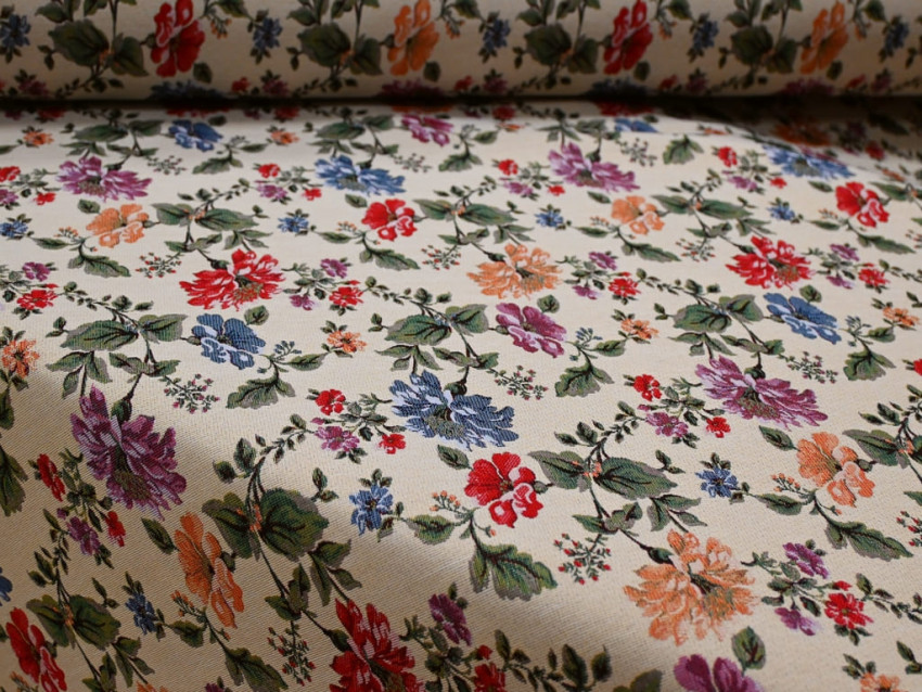 Gobelino floral clásico multicolor sobre fondo beige, ancho 280 cm y 310 g/m², 65% poliéster 35% algodón. Resistente y con cuerpo, ideal para tapicería, cojines, cortinas y complementos decorativos de estilo tradicional.
