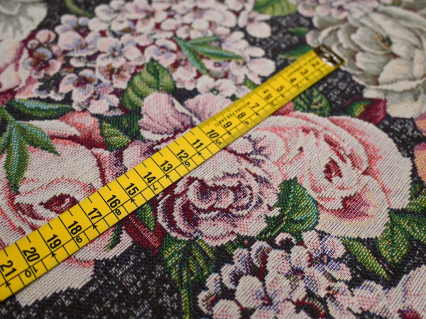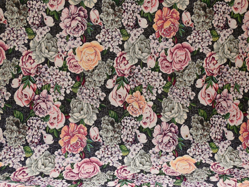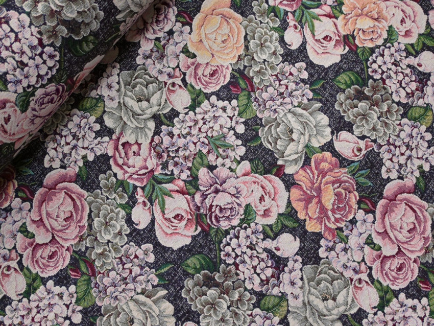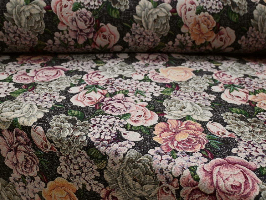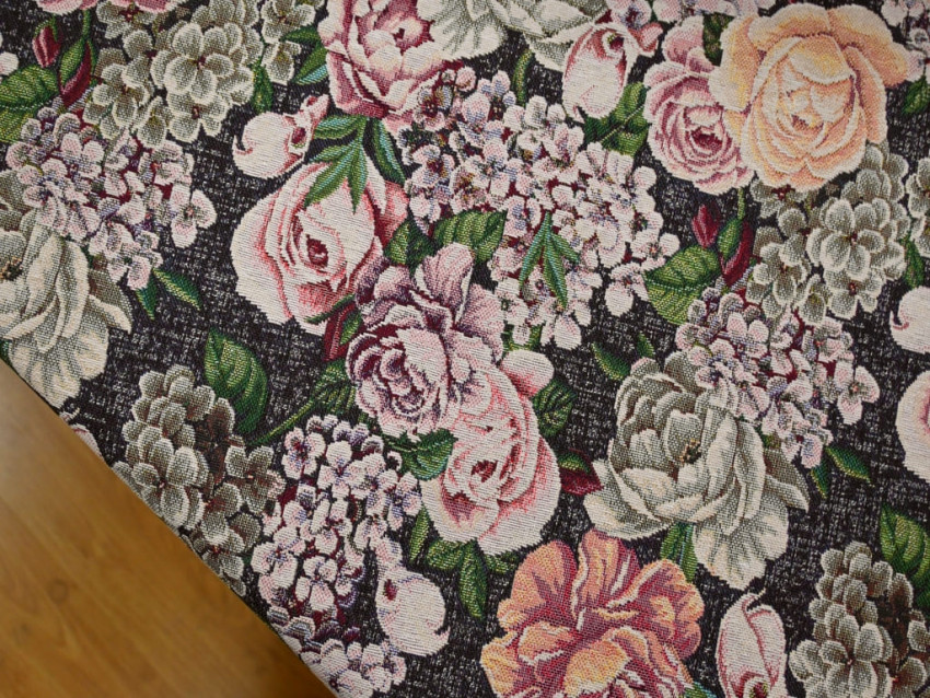 Gobelino floral romántico en tonos suaves sobre fondo oscuro, ancho 280 cm y 310 g/m², mezcla 65% poliéster 35% algodón. Firme y resistente, ideal para tapicería, cojines, cortinas y decoración con carácter elegante.