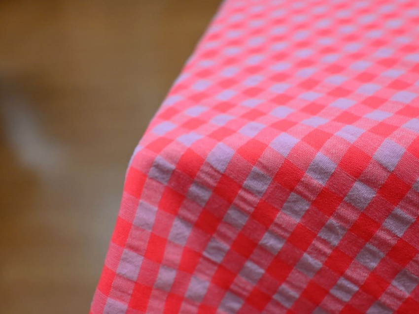 Vichy seersucker rosa neón con textura arrugada y acabado fluido. Ligero, fresco y perfecto para prendas con movimiento.