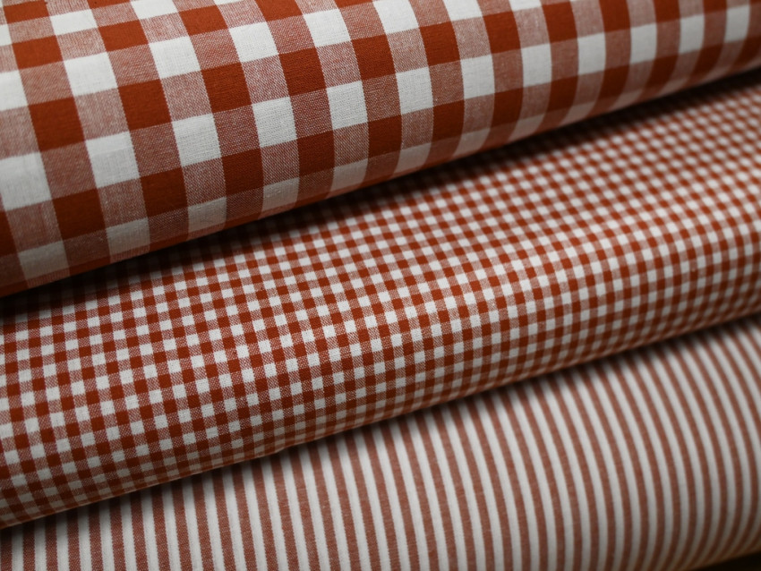 Vichy de cuadros medianos (0,27 cm): Con cuadros de tamaño intermedio, esta tela es ideal para prendas de vestir como camisas, vestidos y blusas, aportando un estilo clásico y a la vez vibrante en color caldera.