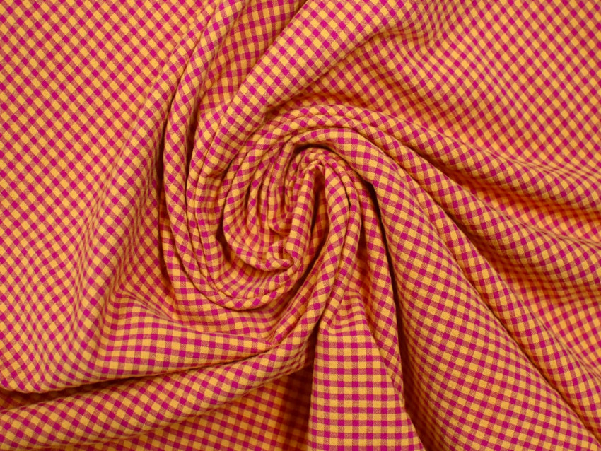 Tela Vichy Seersucker de 140 cm de ancho en un vibrante diseño de amarillo mostaza y buganvilla. Cuadro 4 mm.