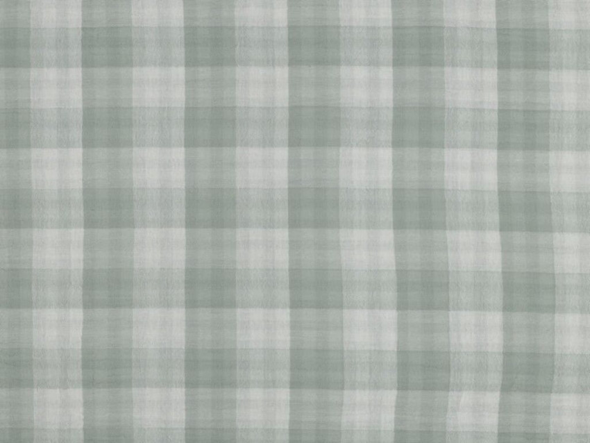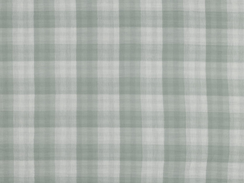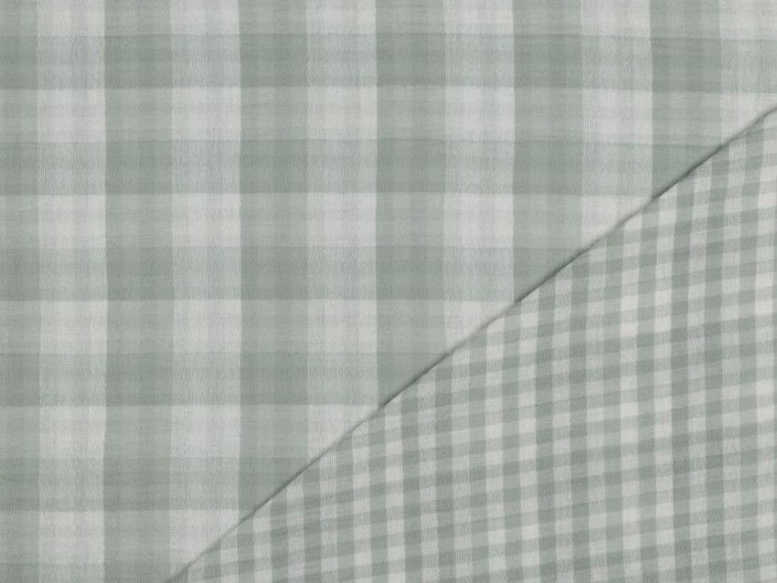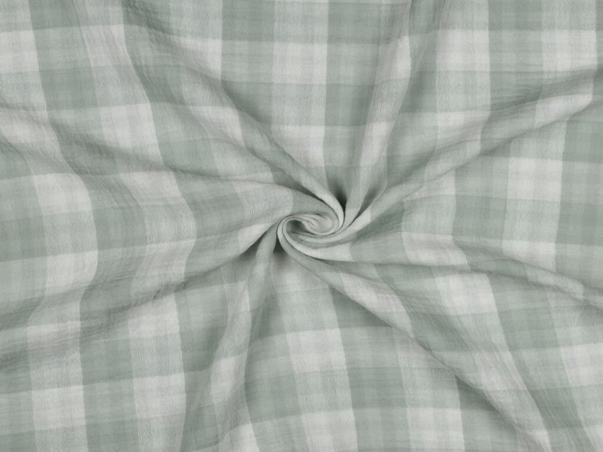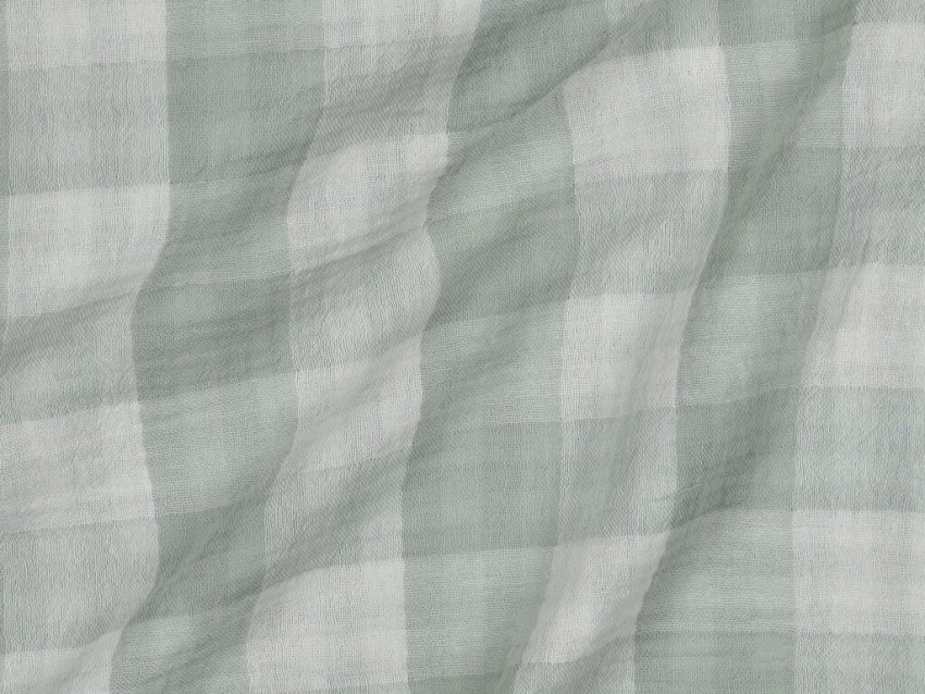 Este tejido es una muselina de algodón tipo doble gasa, también conocida como double gauze, con estampado de cuadros grandes en un delicado tono agua marina sobre fondo blanco. Está compuesta por dos capas finas de algodón 100 % unidas sutilmente entre sí, lo que genera una textura arrugada natural, muy característica y valorada por su estética relajada y su tacto extremadamente suave.