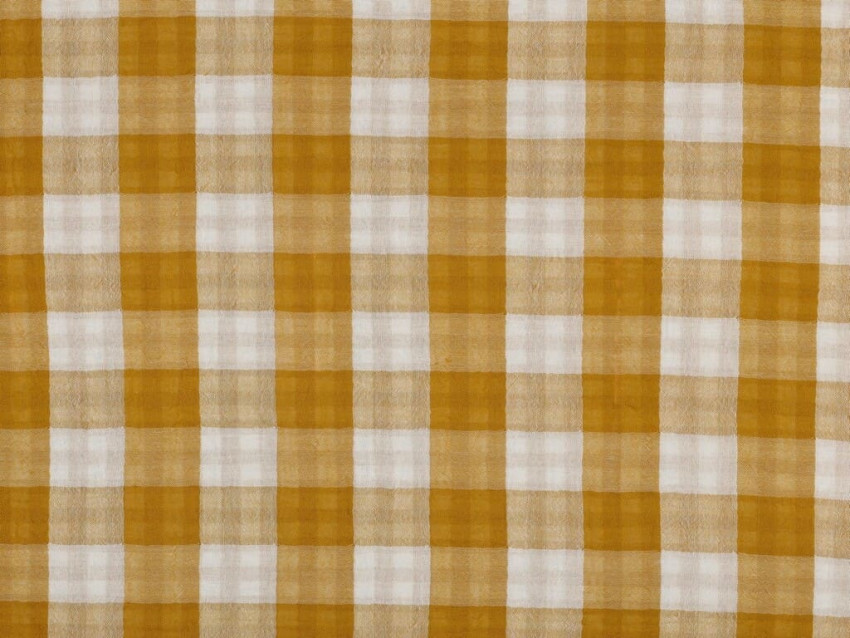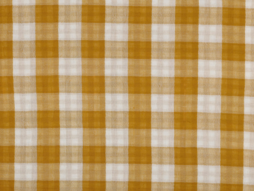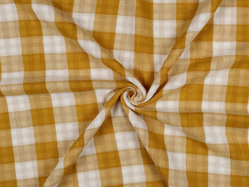 Esta muselina de algodón 100 % tipo doble gasa, también conocida como double gauze, se presenta en un cálido y actual color ocre con cuadros sobre blanco. Está formada por dos capas finas de algodón unidas de forma casi imperceptible, creando un tejido suave, aireado y naturalmente arrugado que no necesita planchado.