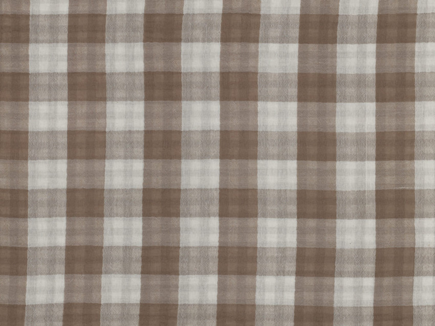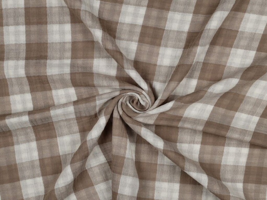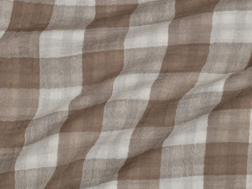 Esta doble gasa de algodón 100 %, también conocida como muselina, destaca por su diseño clásico de cuadros grandes en color cámel sobre fondo blanco, con reverso de cuadros pequeños. Es un tejido ligero, de 130 cm de ancho y 120 g/m², que combina confort, suavidad y estética natural con una arruga característica que le da personalidad.