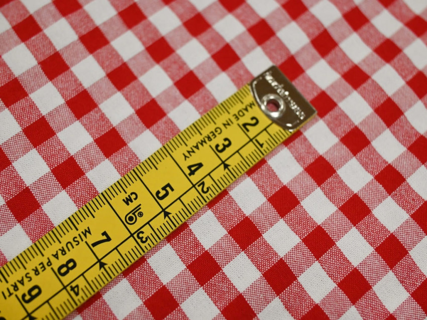 Para casar los cuadros, corta las piezas respetando la dirección del dibujo. El patrón vichy de tamaño medio facilita el alineado.